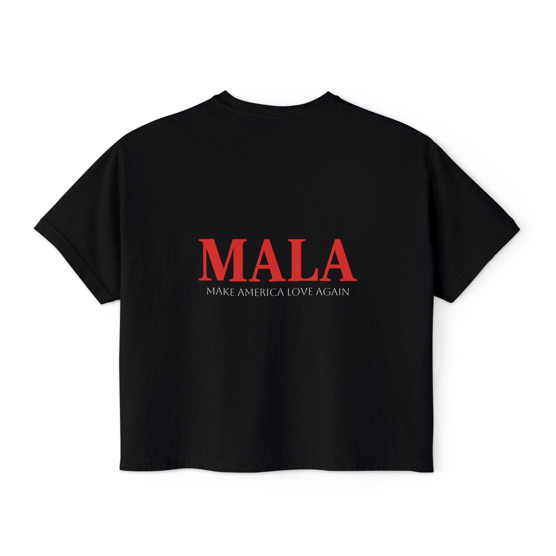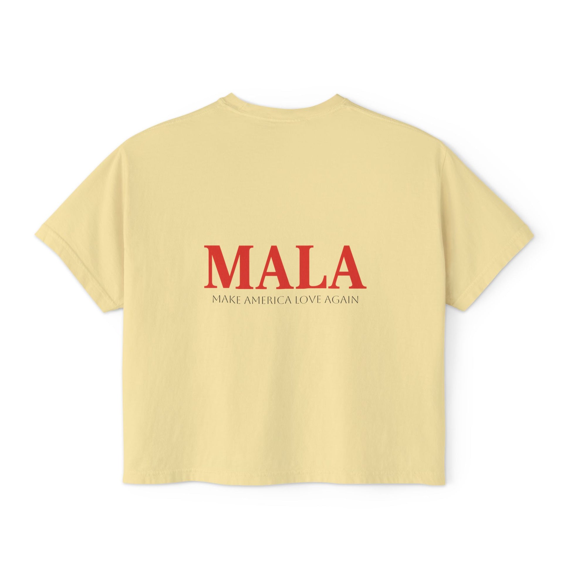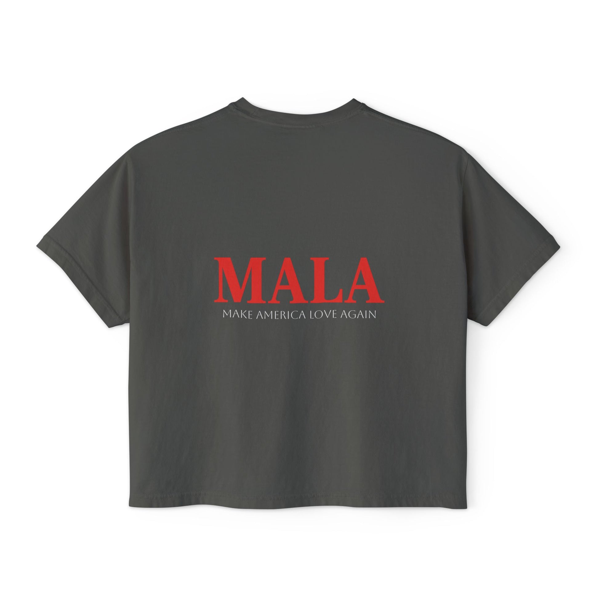 Soft, lived-in comfort with a confident edge. This boxy tee brings breathable, heavyweight cotton and a slightly cropped silhouette together with understated graphics — a small front illustration and bold, typographic back reading “MALA.” It wears like a favorite right away: the pigment-dyed fabric offers a mellow, vintage wash that softens over time while shoulder-to-shoulder twill keeps the shape intact. Throw it on with high-waist jeans, layered under an oversized blazer, or paired with relaxed shorts for weekend wandering. Casual, resilient, and expressive — it suits people who favor quiet statements and garments that age beautifully alongside their everyday moments.